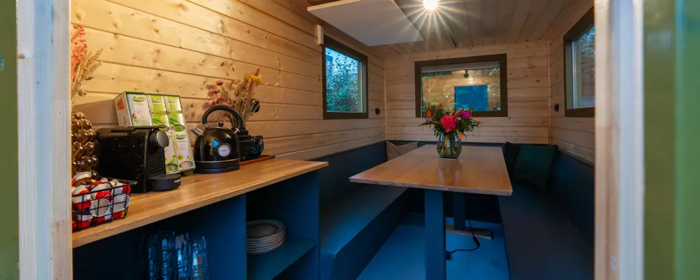 Beide unieke vergaderplekken zijn ontworpen om een omgeving te bieden waarin creativiteit en productiviteit naadloos samenkomen. Deze unieke vergaderplek is ideaal voor teams die willen ontsnappen aan het traditionele kantoor en zich willen onderdompelen in een ontspannen en stimulerende sfeer. Elke kleine vergaderruimte is voorzien van moderne voorzieningen om ervoor te zorgen dat je vergaderingen zowel effectief als plezierig zijn. Deze vergaderruimtes zijn perfect voor brainstormsessies en bieden een ruimte waar ideeën kunnen stromen en innovatie kan gedijen. De onconventionele "Tiny House" setting helpt mentale barrières te doorbreken, waardoor mensen creatief gaan denken en innovatieve oplossingen vinden. De twee vergaderzalen zijn ook rustig en vrij van afleidingen, waardoor teams zich kunnen verdiepen in strategische planning en besluitvorming. De creatieve vergaderruimtes zijn bovendien voorzien van alle benodigde technologie, waaronder stopcontacten en wifi, zodat het vergaderen productief en efficiënt verloopt. De unieke setting stimuleert ook creatief probleemoplossend vermogen en strategisch denken.